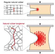 When a crack forms in the new material, the long spaghetti strands spread out the stress by sliding past each other, allowing more rubber to crystallise as it stretches, and overall making the material stronger and more resistant to cracking.